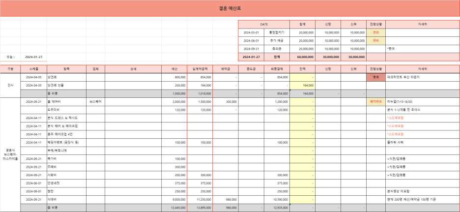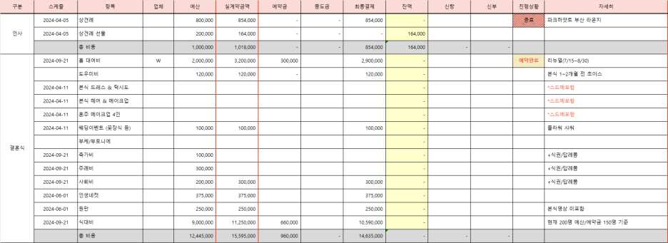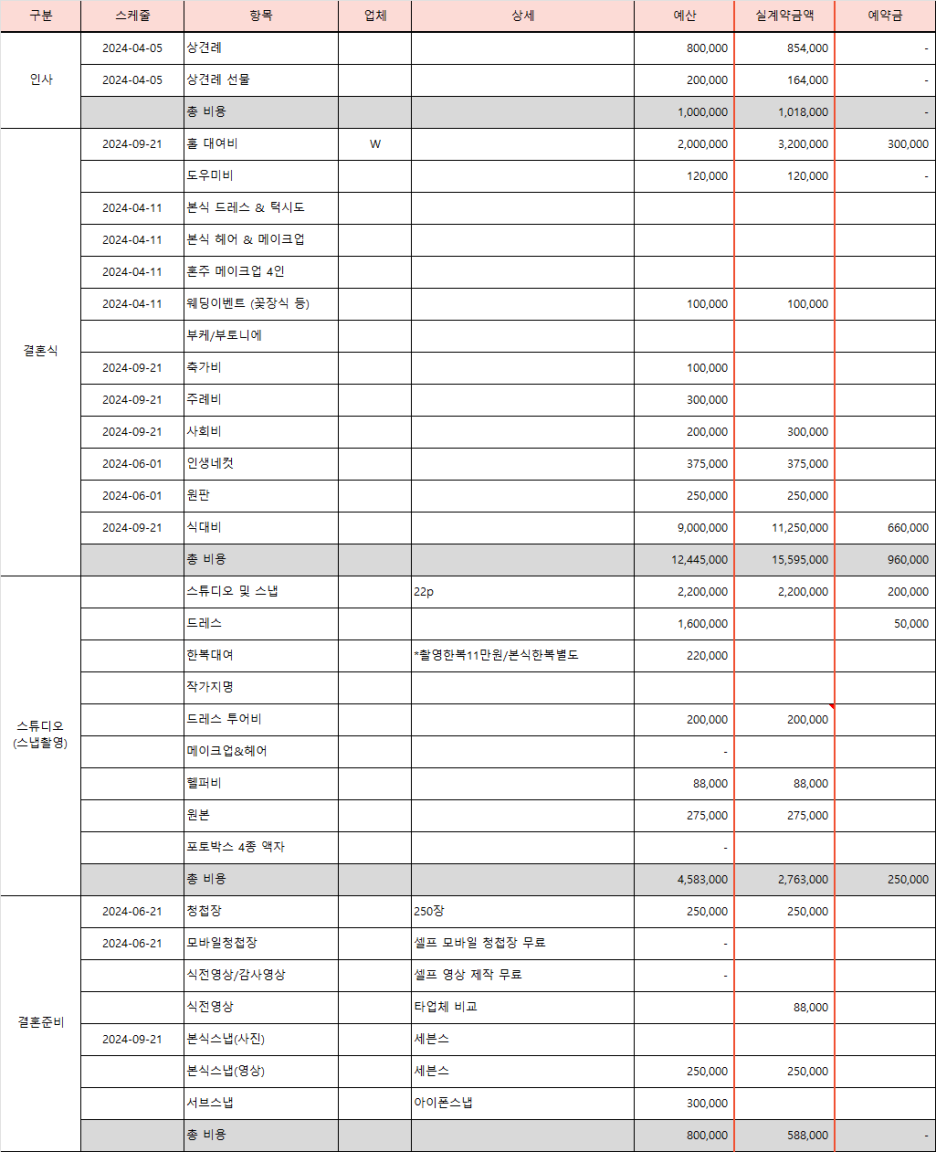 결혼을 준비하면서 예산 관리는 가장 중요한 과정 중 하나인데요, 다양한 항목이 많고 금액도 천차만별이라 처음에는 머리가 어지러울 때가 많죠. 웨딩페어에서 대략적인 금액은 파악했지만, 이제는 하나하나 구체적으로 정리할 때가 왔습니다.
