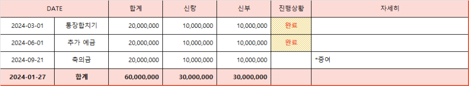 결혼 준비 과정 중, 언제 완료했는지 확인할 수 있는 진행 상황 표시 항목도 마련되었습니다. 각 항목에 대해 ‘완료’, ‘진행 중’, ‘확인 필요’ 등을 표시하여, 결혼 준비가 어느 정도 진행되었는지 쉽게 파악할 수 있습니다.