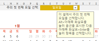 주의 첫 번째 요일을 선택하면 월요일부터 일요일까지 요일을 변경할 수 있습니다.